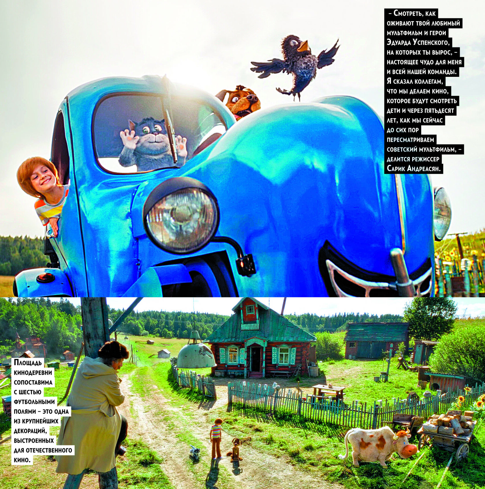 В киноленте «Простоквашино» знакомую историю сняли в формате live-action, когда настоящие актеры взаимодействуют в кадре с анимированными героями. Мультяшными стали, например, кот Матроскин, пес Шарик, корова Мурка, теленок Гаврюша и даже трактор Тр-тр Митя. Он, кстати, впервые появился на экране. На раннем этапе обсуждали идею, чтобы Мурку и Гаврюшу играли настоящие животные, однако позже создатели решили всех зверей сделать анимированными, дабы сохранить стиль и атмосферу оригинальных мультфильмов. В основе киноленты – повести Успенского, и, по словам режиссера и продюсера Сарика Андреасяна, в картину добавили много деталей из книг.